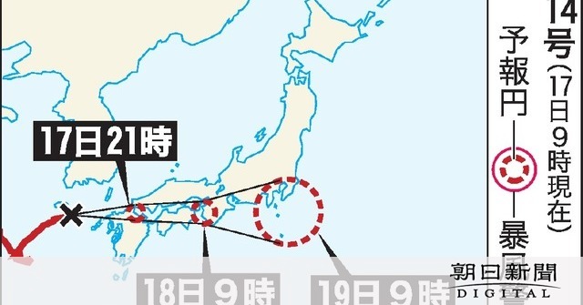 台風14号は17日夕から夜のはじめごろ、九州北部に上陸する見通し。気象庁によると、18日にかけて四国や近畿などを通過し、東日本の太平洋側を進むとみられる。西日本から北日本の広い範囲で大雨となるおそれがある。