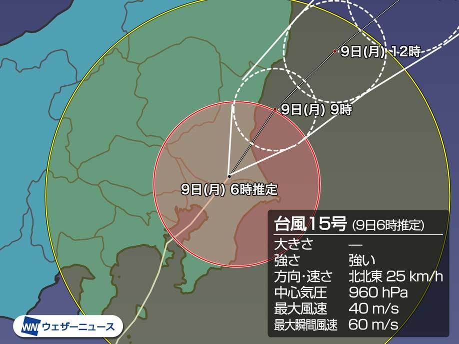 台風15号は5時の時点で、中心付近の最大風速が40m/sと解析されています。統計開始以来、最も強い勢力で関東地方に上陸したことになります。