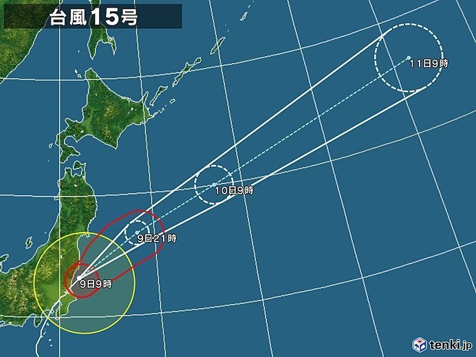 台風15号は9日9時現在水戸市の東約50kmを北東に毎時30キロの速度で進んでいます。台風15号の中心は海上に進みましたが、暴風域が千葉県や茨城県の一部にかかっています。関東地方や福島県の広い範囲が強風域に入っています。これまでの暴風で道路には木々や物が散乱しています。風によって飛んでくる恐れもあります。引き続き周辺に注意してお過ごし下さい。また、9日10時現在、関東地方では80万軒以上、停電をしている所があります。クーラーが使えない状況になっていますので、日陰で風通しの良い場所で暑さ対策をして下さい。