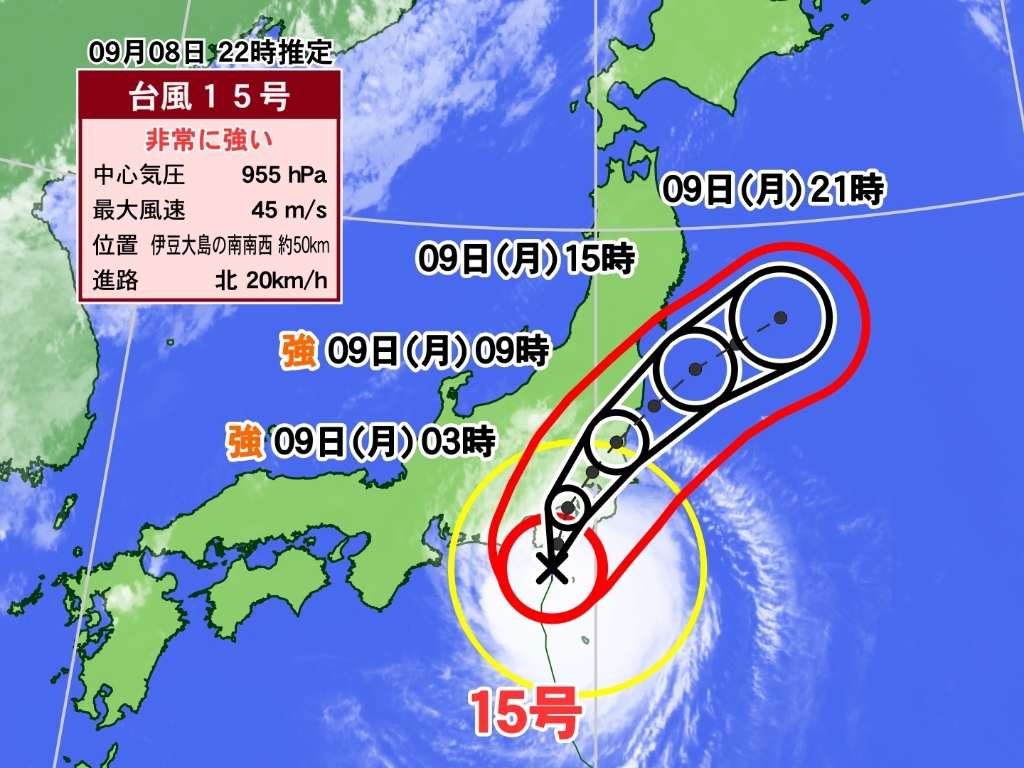 非常に強い台風15号は、8日午後9時には伊豆大島の南南西約80キロにあって、1時間に約20キロの速さで北へ進んでいる。