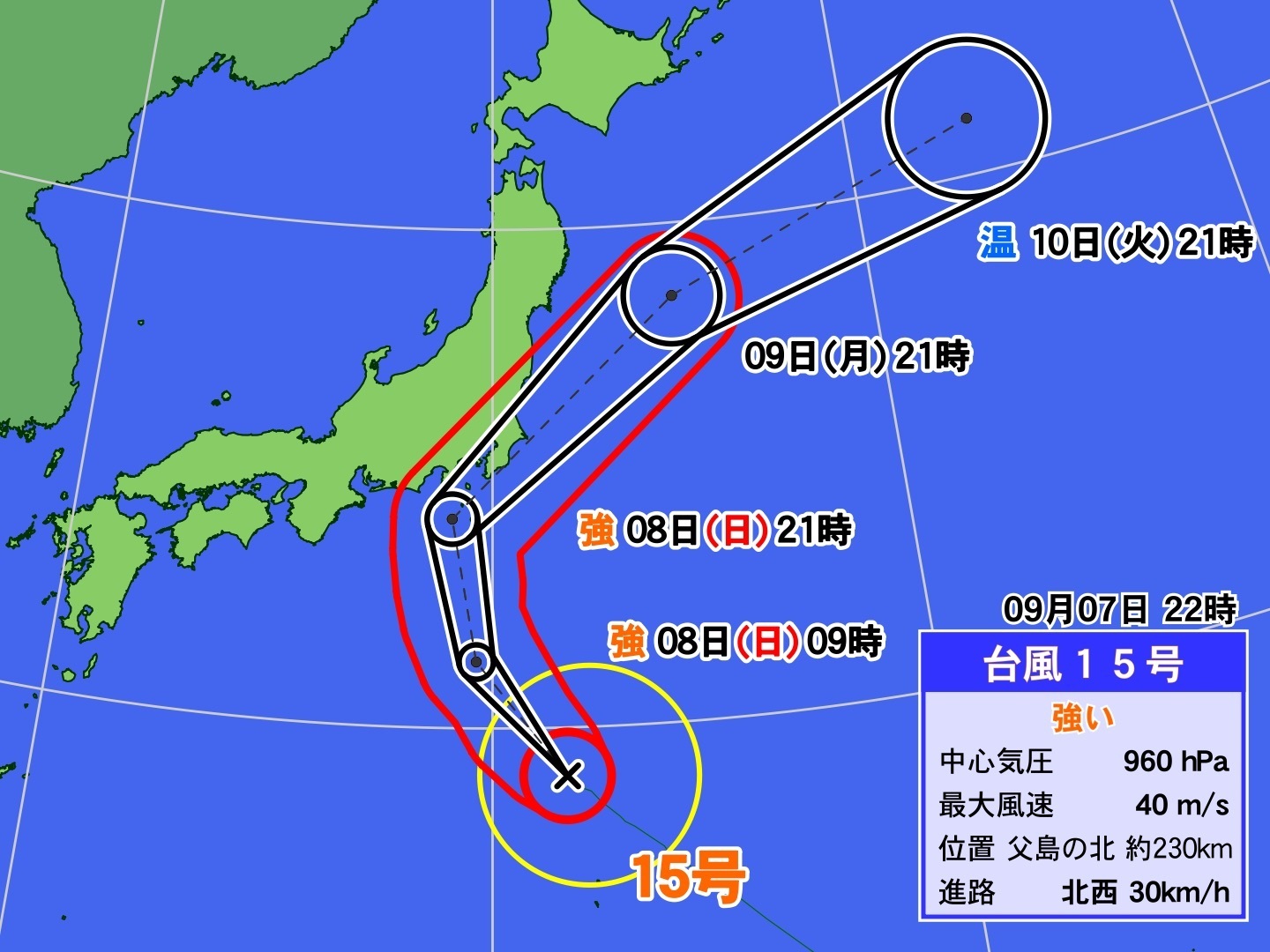 強い台風15号は、7日午後10時には父島の北にあって、1時間に約30キロの速さで北西へ進んでいる。中心付近の最大瞬間風速は60メートル。