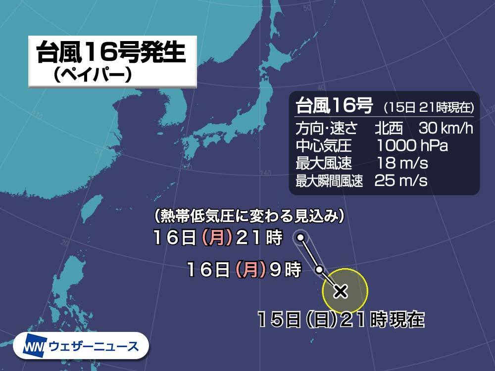 9月15日(日)21時、マリアナ諸島で発達中の熱帯低気圧が台風16号(ペイパー)になりました。この先は発達せず、今後24時間以内に勢力を落として熱帯低気圧に変わる予想です。日本への影響はありません。