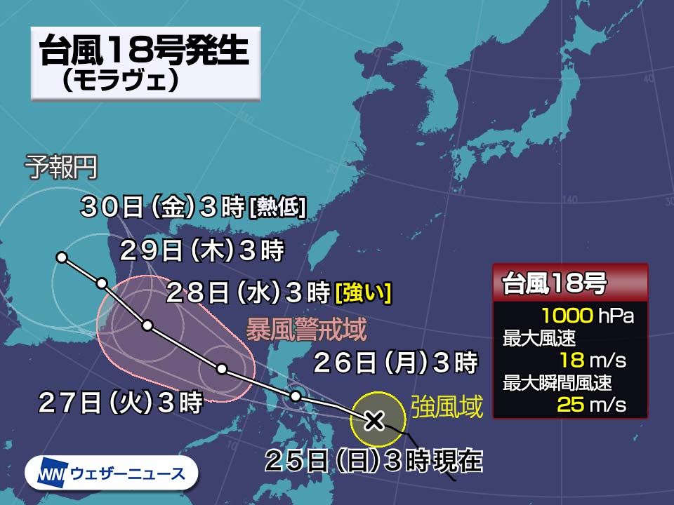 10月25日(日)3時、フィリピンの東で発達中の熱帯低気圧が台風18号(モラヴェ )になりました。 今月5つ目の台風発生で、10月の発生数としては7年ぶりの多さとなります。 台風18号は明日にかけてフィリピン付近を通過したあと南シナ海に進むため、日本への直接の影響はありません。 ▼台風18号 10月25日(日)3時