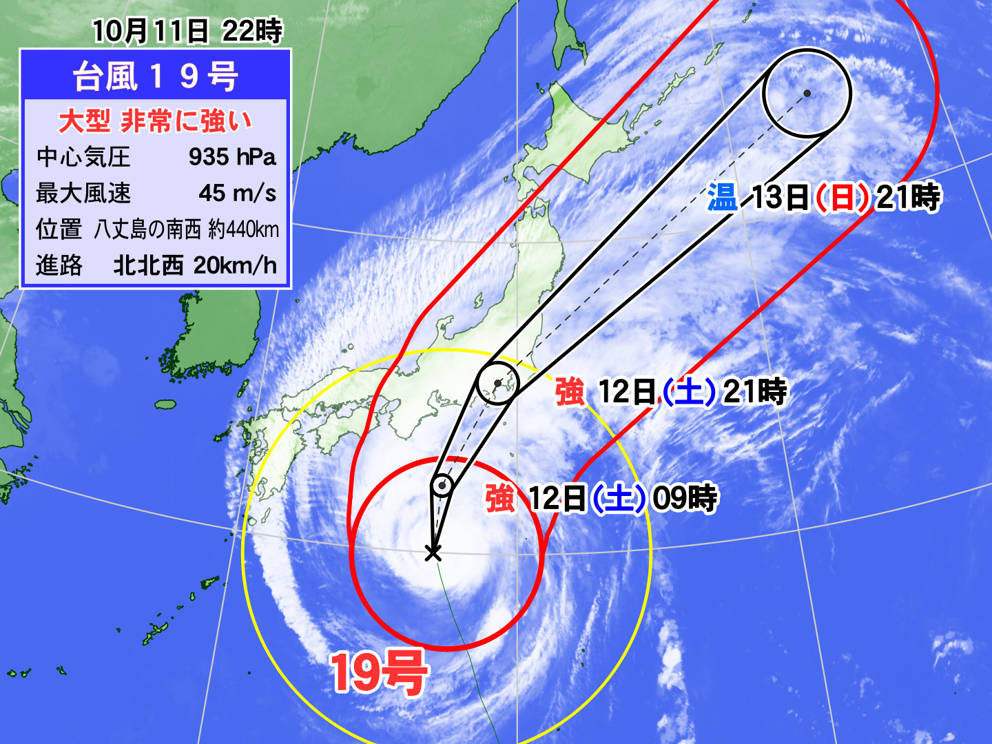 台風19号は、11日(金)午後10時には八丈島の南西にあって、1時間に約20キロの速さで北北西へ進んでいる。中心付近の最大瞬間風速は65メートル。台風は、次第に進路を北北東に変えて、非常に強い勢力を保ったまま、12日夕方から夜にかけて、東海地方または関東地方に上陸し、13日(日)にかけて速度を速めながら東日本から東北地方を北東に進む見込み。その後、北海道の南東海上で温帯低気圧に変わる予想。