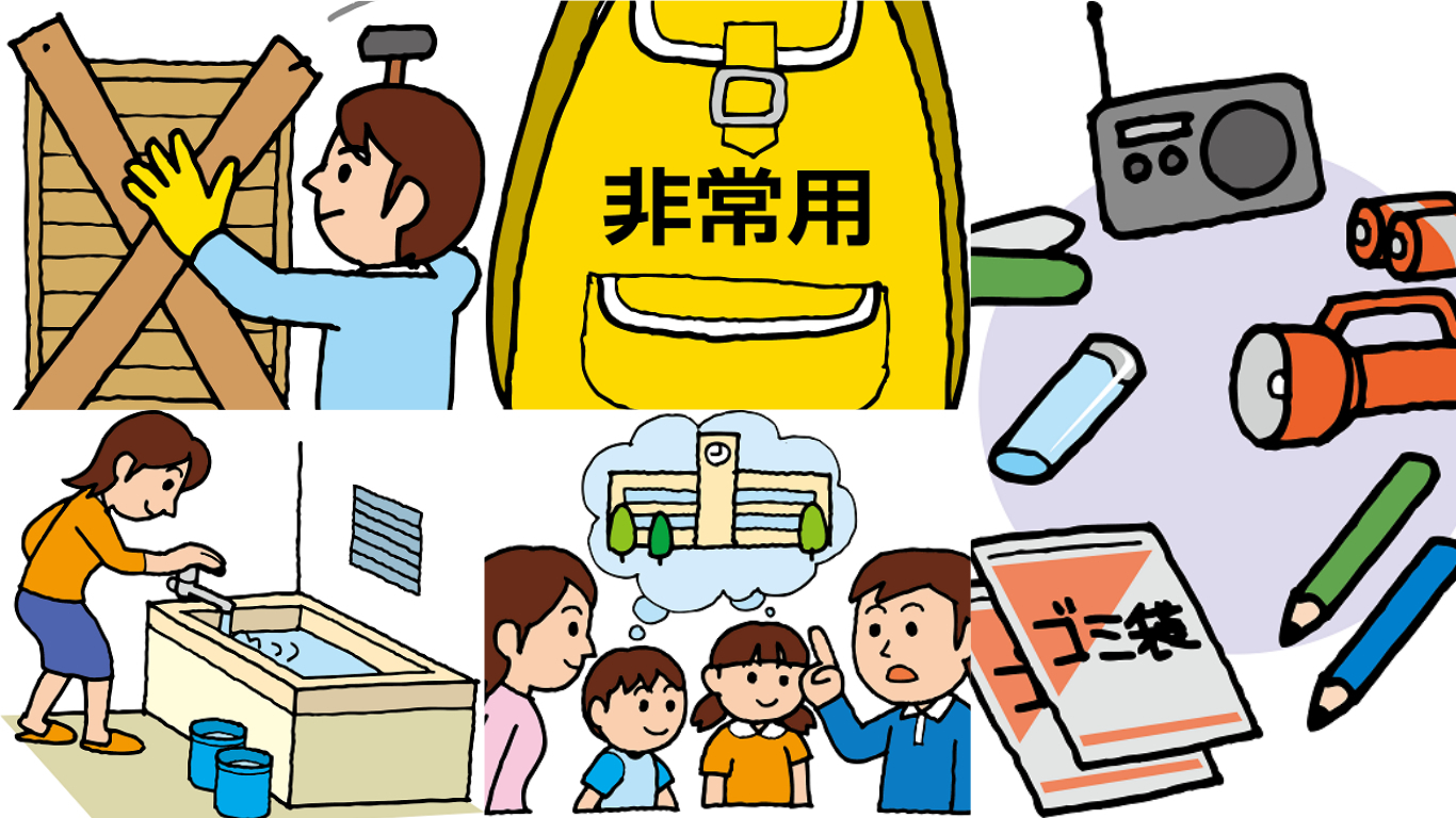 飲料水、携帯食料品、貴重品(預金通帳、印鑑、現金、健康保険証など)、携帯電話、救急用品、お薬手帳、ヘルメット・防災ずきん、マスク、軍手、筆記用具、マッチ・ライター、懐中電灯、電池、ビニール袋、衣類、雨具、下着、タオル、携帯ラジオ、予備電池、携帯電話の充電器、携帯電話の充電用バッテリー、使い捨てカイロ、ウェットティッシュ、洗面用具、携帯トイレ、メガネ・コンタクト、乳児のいる家庭はミルク・紙おむつ・ほ乳びんなど。