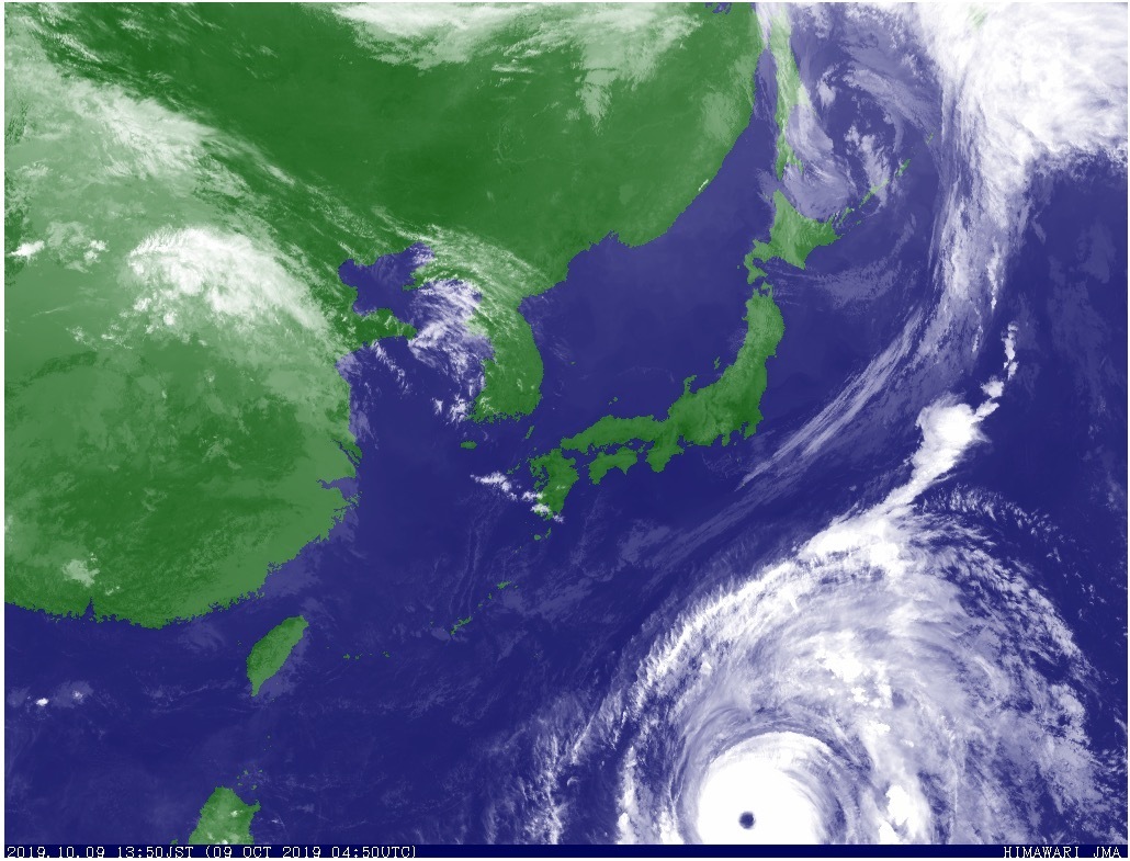気象庁予報部(9日12時45分発表)によると、大型で猛烈な台風19号は9日午後12時現在、小笠原近海を1時間に約15キロの速さで北西に進んでいる。