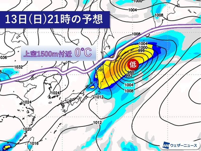 13日(日)夜には温帯低気圧に変わりながら北海道の東の海上に達し、道東地方を中心に雨を降らせます。低気圧が北からの寒気を引き込み、山沿いでは雨ではなく雪になる見込みです。
