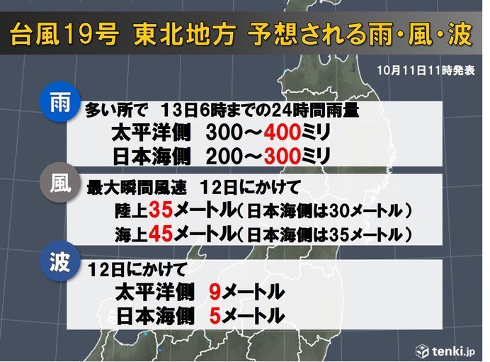 東北地方の海は、12日(土)にかけて、太平洋側では9メートルの波が予想され、13日(日)にはさらに高く10メートルとなる予想です。猛烈にしけるでしょう。さらに、大潮の満潮時刻が、台風接近時刻と重なりそうです。高波に加えて高潮による沿岸施設の被害や浸水の被害が考えられますので、海岸付近には絶対に近づかないでください。