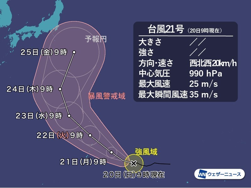 台風は明日21日(月)には強い勢力となり、さらに発達を続けて23日(水)に非常に強い勢力となる予想です。