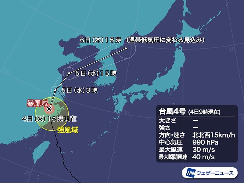 明日5日(水)の午後には黄海に達し、温帯低気圧に性質を変えながら朝鮮半島から日本海に進む予想です。 温帯低気圧に変わっても多くの水蒸気を保持しているため、周辺では雨雲が発達しやすくなります。7日(金)は北海道を中心に雨の強まる所が多く、8日(土)にかけては前線の影響を受ける東北でも強い雨が降る見込みです。 局地的には総雨量が200mm前後の大雨になるおそれがありますので、最新の情報を確認し、雨への備えを行ってください。