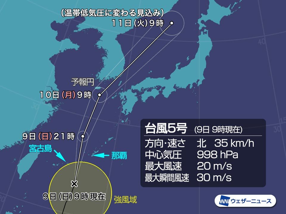 沖縄付近を通過した後、台風はやや東寄りに進路を変えて今夜には東シナ海に達し、その後は勢力を弱めながら朝鮮半島方面に進む見込みです。 本州を直撃する可能性はほとんどありませんが、九州では今日9日(日)の深夜から明日10日(月)にかけて台風の発達した雨雲が流れ込み、激しい雷雨に見舞われるおそれがあります。 台風の進路に近い五島列島や対馬では吹き荒れる強風や高波にも警戒が必要です。