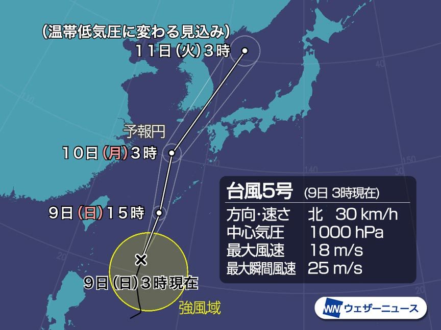 台風5号は今日9日(日)午後から明日10日(月)にかけて、沖縄の先島諸島と沖縄本島地方の間を北上する予想です。飛ばされやすいものの屋内待避、停電に備えた電源の確保などの対策を、午前中のうちに済ませるようにしてください。 また今回の台風5号は、中心よりも東側で特に雨や風が強まる予想です。台風が接近する宮古島地方や、台風の東側の雨雲がかかる沖縄本島地方では、大雨や落雷、強風、高波に十分注意してください。 台風はその後もあまり発達はせず、東シナ海を北上して朝鮮半島方面へ進み、勢力を落として日本海で温帯低気圧に変わる予想です。 本州方面へ直撃する可能性はほとんどありませんが、台風の北上に伴って湿った空気が流れ込みやすくなるため、西日本を中心に局地的に雨が強まるおそれがあります。急な強い雨にご注意ください。 また、温帯低気圧になった後に北海道方面に雨を降らせる可能性も否定出来ないため、今後の情報に注意するようにしてください。