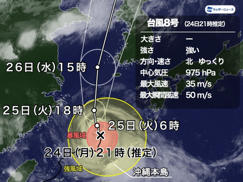 8月24日(月)21時の推定位置で、台風8号(バービー)は沖縄・久米島の北の海上を北に進んでいると見られます。中心付近の最大風速が35m/sに達し、強い勢力になっています。今後も北寄りに進み沖縄からは離れるものの、動きが遅いため、今日いっぱいは大雨や暴風に警戒が必要です。 ▼台風8号 8月24日(月)21時推定
