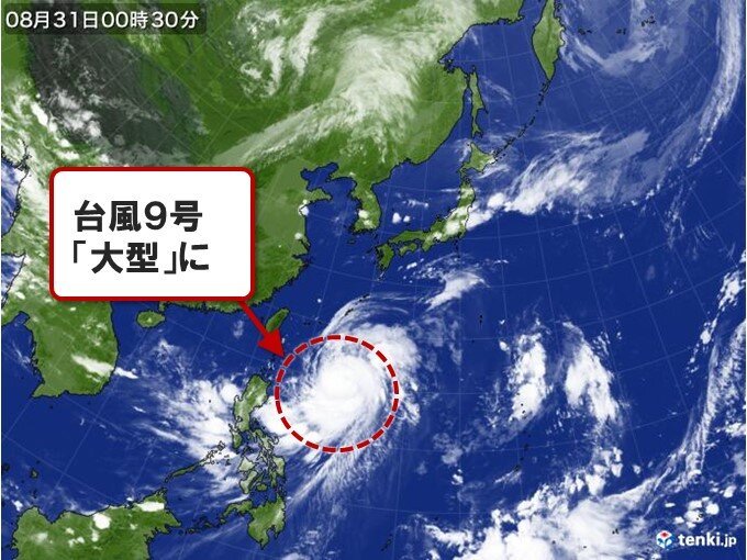 台風9号は31日0時、「大型」になりました。台風の大きさは風速15メートル以上の半径で決まり、「大型」は半径500キロ以上から800キロ未満になります。今後も最新の台風情報をご確認下さい。