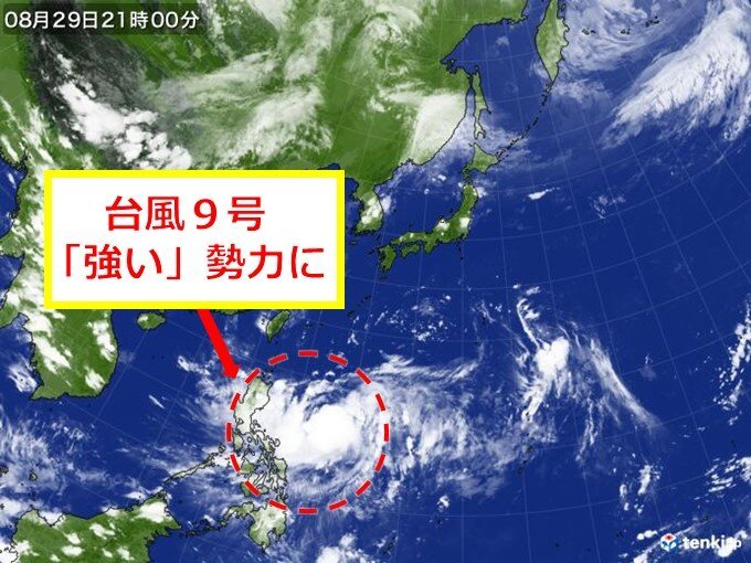 29日21時、台風9号は「強い」勢力になりました。強い台風9号は、フィリピンの東をゆっくり西北西へ進んでいます。今後さらに発達し、31日から9月1日に沖縄地方へ接近する見通しです。