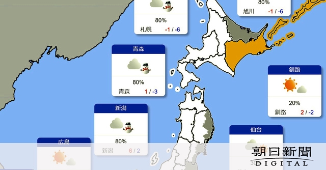 気象庁によると、冬型の気圧配置が強まる見通しで、特に25日は全国的に冷え込みが厳しくなりそうだ。札幌市では今季初めて、最高気温が0度を下回る「真冬日」を観測する可能性がある。他の地域では軒並み12月中~下旬並みの寒さとなる見込み。予想される最高気温は仙台、新潟が各6度、名古屋11度、東京、大阪、広島、福岡が各12度など。強い北風の影響で体感温度が下がるという。