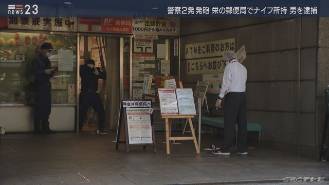 17日午後、名古屋市中区・栄の郵便局にナイフを持った男が押し入り、女性客を人質に取り現金221万円を奪って逃げました。警察は拳銃を2発発砲し男を現行犯逮捕しました。 17日午後4時前、中区栄の名古屋南大津町郵便局にナイフを持った男が押し入りました。 男は56歳の女性客を人質に取り「200万円を出せ」と脅すと現金221万円を奪い女性を連れて逃走。女性は左腕などに軽いけがをしました。 駆け付けた警察官が拳銃を1発発砲すると男は女性を残しタクシーで逃げました。 その後、男が警察官に襲いかかり警察官が再度1発発砲しました。