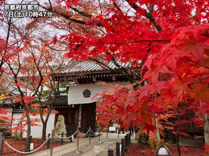 午後も広範囲で曇天が続く見込みですが、明日8日(日)は冬型の気圧配置となって、太平洋側を中心に青空が広がります。チャンスを逃さずに紅葉狩りを楽しんでください。
