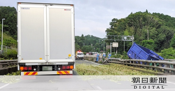 20日午前4時ごろ、奈良県山添村の名阪国道で、名古屋方面に向かう車線を走っていた兵庫県の50代男性が運転する10トントラックが横転、積んでいたブタのえさ用のブロッコリーなど野菜くずが幅約15メートル、長さ約30メートルにわたって路上に散乱した。男性は頭に軽いけが。事故の影響で、名古屋方面行き車線が約2時間通行止めになった。