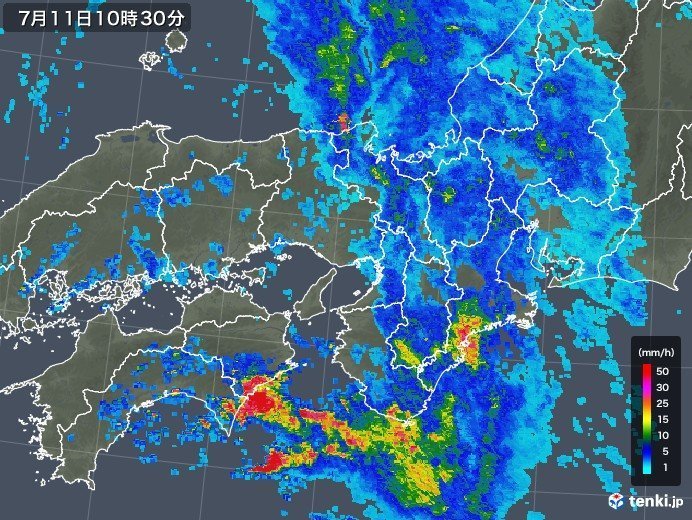 高知県室戸岬で1時間に58.5ミリの激しい雨を観測。午前10時半現在は近畿や東海にまとまった雨雲がかかっています。