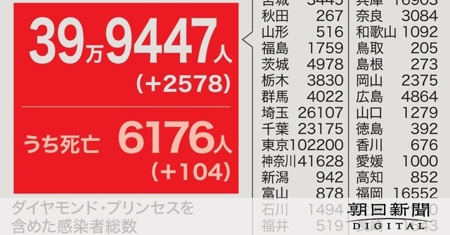 新型コロナウイルスの国内感染者は4日午後8時現在で、新たに2578人が確認された。クルーズ船ダイヤモンド・プリンセスの乗船者を含む累計では40万人を超えたが、1日あたりの新規感染者は5日連続で3千人を下回った。
