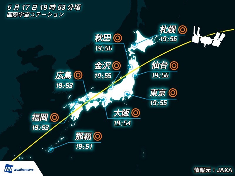 JAXA(宇宙航空研究開発機構)によると、5月17日(日)19時53分頃に、国際宇宙ステーション/きぼうが日本付近を通過します。
