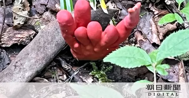 土の中から人の指が突き出ているような独特の形状。地元の岡山県真庭市はキノコ狩りや山歩きの人たちに「絶対に触らないように」と注意を呼びかけている。