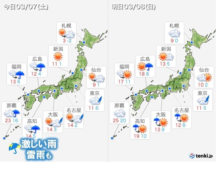 きょう7日(土)は、西から低気圧が近づく。雷を伴い、激しい雨の降る所も。あす8日(日)にかけて、低気圧の雨雲はゆっくり東へ。