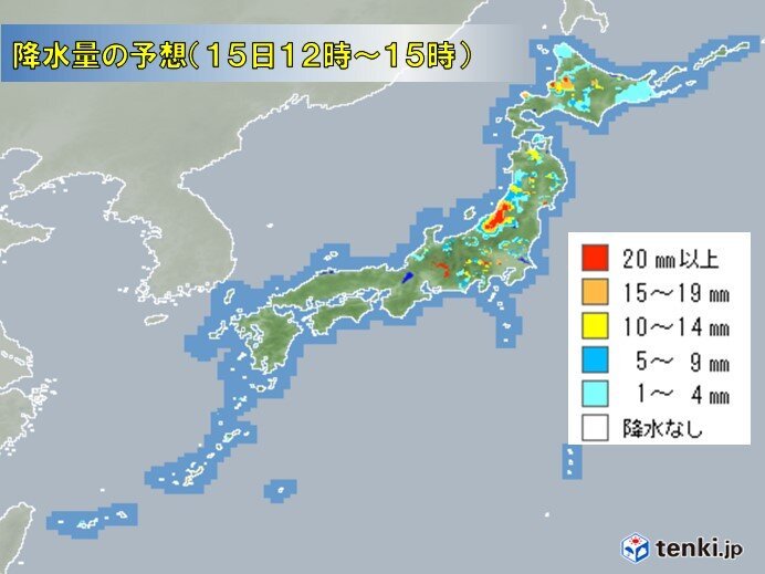 北海道や東北では、15日は局地的にカミナリを伴った激しい雨が降り、大雨の恐れがあります。関東付近は、15日、16日の午後は、雨雲やカミナリ雲がかかるでしょう。