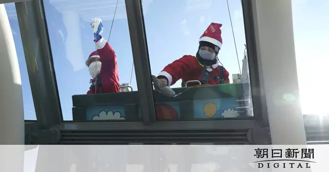 東京スカイツリー(東京都墨田区、高さ634メートル)で、サンタに扮した作業員が展望台の窓拭きをしている。高さ450メートルと350メートルにある展望台の窓拭きは気象状況に合わせて実施。サンタ姿での清掃は2016年から始め、この時期の風物詩になっている。都心の景色を眺めていた人たちは突然のサンタの登場に歓声を上げていた。(池田良)