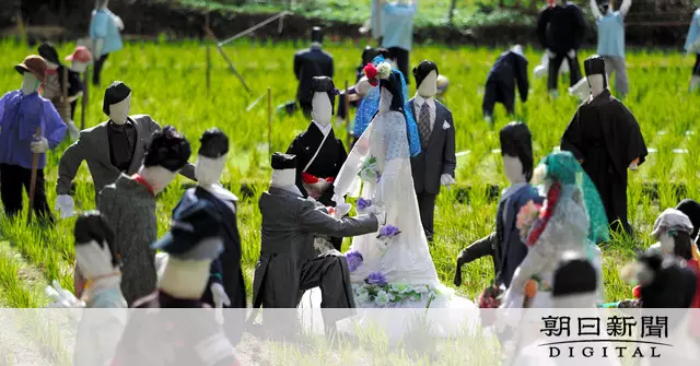 同会の高橋ふくみ代表(68)は「住民35人の地区に10倍のかかしを作った。生き生きとした姿を見て楽しんで」。今月末まで楽しめるという。(藤脇正真)
