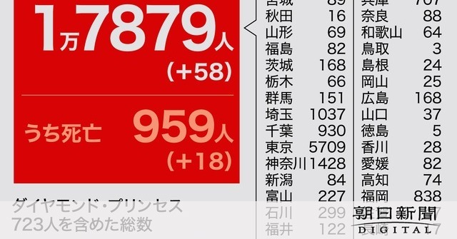国内の新型コロナウイルスの感染者は19日、午後9時現在で新たに58人が確認され、累計で1万7879人になった。東京で3人、北海道と神奈川で1人ずつ亡くなった。埼玉県はこの日、死者の集計方法を変更したとして、13人の死者を新たに計上。国内の死者は959人となった。