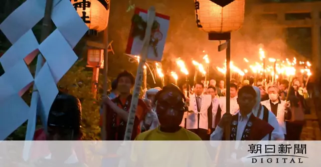 午後7時前、大山中腹の下山神社で、登山用具のザイルなどをおはらいして登山者の安全を祈願する神事が行われた。その後、神火を灯(とも)したたいまつを手にした1千人近い観光客らが、隣接する大神山(おおがみやま)神社の神門そばから石畳の参道を1キロあまり練り歩いた。