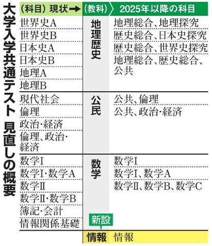 共通テストの問題作成や採点などを担う大学入試センターによると、出題科目は、①地理総合・地理探究②歴史総合・日本史探究③歴史総合・世界史探究④公共・倫理⑤公共・政治経済⑥地理総合・歴史総合・公共。この6科目から最大2科目を選ぶ。