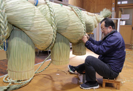 同館では、神社への奉納を中心に年間約50本のしめ縄を手作りで手掛ける。部屋のインテリアとしての注目も高まっているといい、17年8月にはUAEの顧客に届けた。那須久司専務理事(65)は「小さな町から世界へと、しめ縄文化を発信できてうれしい」と喜んでいた。