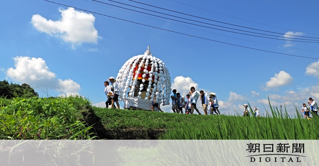 大分県中津市で27日、夏の風物詩「鶴市花傘鉾(はなかさぼこ)祭り」の巡行が3年ぶりにあり、高さ3~4メートルの華やかな傘鉾19基がそれぞれの地区を回った。例年のような勢ぞろいの行列とはならなかったが、笛や太鼓などを奏でながら練り歩いた。