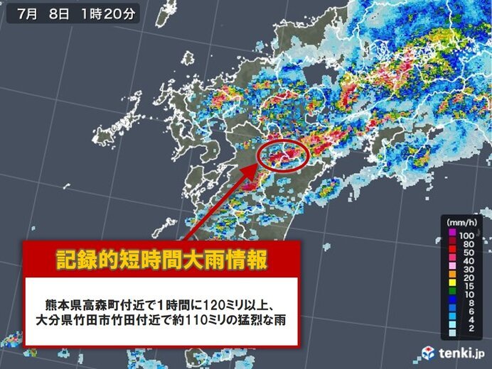 大分県竹田市竹田付近では8日1時20分までの1時間に約110ミリの猛烈な雨が降ったとみられ、また、熊本県高森町付近では8日1時20分までの1時間に120ミリ以上の猛烈な雨が降り、「記録的短時間大雨情報」が発表されました。