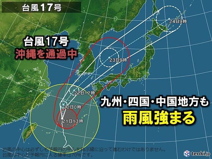 21日(土)、大型で強い台風17号は沖縄を通過中。九州でも既に発達した雨雲がかかっている所があり、22日(日)は台風の北上に伴って、九州、四国、中国地方を中心に雨や風が強まる。