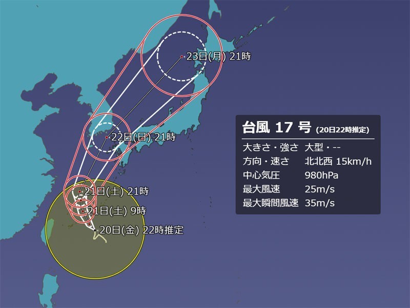 今日20日(金)22時の推定で、大型の台風17号は宮古島の東南東にあり、北北西に進んでいます。台風が近づいている沖縄や奄美は徐々に風が強まっていて、21時30分までに観測された最大瞬間風速は沖縄本島の糸数で29.2m/s、与那国島で28.9m/sなど看板やトタン板が外れるレベルの強風になっています。