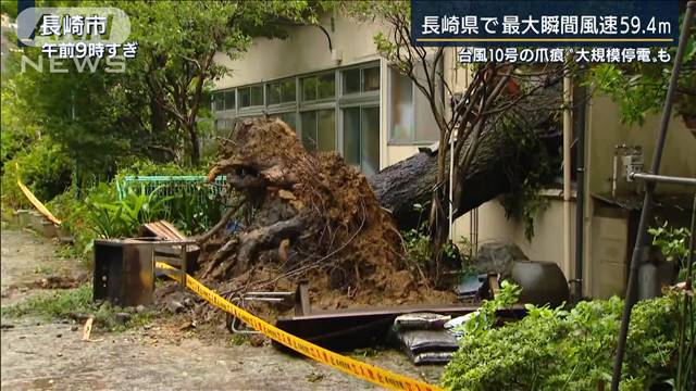 “今年最強”の台風10号は7日、九州全域を暴風域にさらしました。長崎県の野母崎では、観測史上最も強い最大瞬間風速59.4メートルを観測しました。長崎市では、バスの停留所がひっくり返され、吹き飛ばされたプレハブの屋根が道をふさぎました。鹿児島県枕崎市では最大瞬間風速45.9メートルを観測。海に面した家が崩落し、標識も根元から曲がりました。福岡県糸島市の雉琴神社では、樹齢200年のケヤキが倒れ、1700年あまりの歴史を持つ神社の本殿が壊されました。 6日に400ミリを超える雨が降った宮崎県の椎葉村では、土砂崩れが発生。建設会社の事務所と住宅が土砂にのまれ、この住宅に住む70代の男性がけがをしました。男性の妻と長男、技能実習生のベトナム人男性2人の合わせて4人と連絡が取れなくなっています。現場で捜索が行われましたが、土砂から濁った水が出たため、日没までとなりました。鹿児島県阿久根市では、70代の女性が側溝に転落して、亡くなりました。知人宅に避難する途中だったといいます。台風10号では、これまでに、わかっているだけで、80人が重軽傷を負っています。 避難指示と避難勧告は、九州全域と山口県、徳島県、愛媛県に住む約380万人に出されました。ただ、避難所が満員になってしまう自治体が多くあったといいます。宮崎市では、新型コロナウイルスへの対応で避難所の収容人数を半分以下に減らしていました。その分、避難所の数を69カ所から106カ所に増やしましたが、そのうち21カ所が満員になってしまい、他の避難所に振り分けて対応したといいます。福岡県久留米市では、64カ所の避難所のうち、10カ所以上で満員となりました。このなかには、ホテルに入れずに来た住民もいたといいます。 九州全域では一時、約47万世帯が停電。午後9時半現在も、約11万8000戸で続いている状況です。交通機関への影響も続いています。8日は、全日空で13便、日本航空は4便で欠航が決まっています。九州新幹線、山陽新幹線は始発から運転再開予定です。