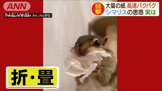 雄のシマリス、トッドちゃん(5)。手にしているのはキッチンペーパー。すると次の瞬間、キッチンペーパーを次から次へ口に運び入れます。別の映像では自分の体よりはるかに長いキッチンペーパーを器用に折り畳みながら口へ詰め込むトッドちゃん。とにかく、素早い。飼い主さんによりますと、涼しい日にはこの行動をよくするといいます。それにしても、リスは何をしているのでしょうか。シマリスを扱うペットショップのスタッフによりますと、寒い時期になって紙などで寝床を暖かくしようと試みているのかもしれないということでした。