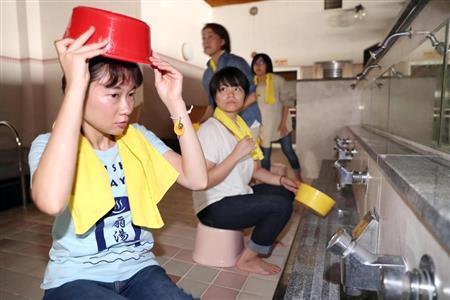 「防災の日」の1日、大阪市阿倍野区の銭湯「湯処あべの橋」で大規模な地震に備えた訓練が行われた。参加者は暗い浴室内で風呂おけなどで頭を守り、従業員の誘導に従って避難した。
