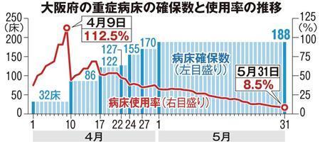 現在は感染が収束傾向にあり、府の5月31日時点の重症患者の病床使用率も8・5%と低水準に収まっている。しかし、6月1日からの休業要請の全面解除に伴い、感染者数が再び増加に転じる可能性もある。