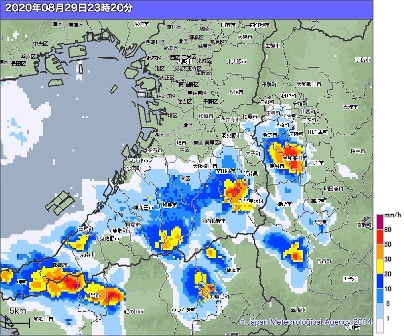 富田林市付近 約100ミリ(午後11時20分) 本州付近には、南から湿った空気が流れ込んでいる影響で、大気の状態が不安定になっている。この後も30日(日)朝にかけて急な強い雨に注意が必要だ。