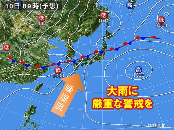 12日(日)にかけても梅雨前線の活動が活発な状態が続くでしょう。10日(金)をピークに九州から関東甲信にかけて活発な雨雲がかかり、局地的に非常に激しい雨や激しい雨が降る予想です。特に、九州や中国、四国、紀伊半島、岐阜県を中心に雨量が多くなると予想されています。平年7月ひと月の雨量に匹敵するような雨が新たに降ると予想される地域があります。九州では多い所で400ミリもの大雨がさらに降る恐れがあります。 球磨川や筑後川、飛騨川などで氾濫が発生するなど、すでに甚大な被害が発生しています。そのほかにも、これまでの大雨で、土砂災害や洪水の危険度が高い状態が続いている所があります。今後の大雨で新たな災害につながる恐れもあります。土砂災害や低い土地の浸水、河川の増水や氾濫に厳重に警戒して下さい。