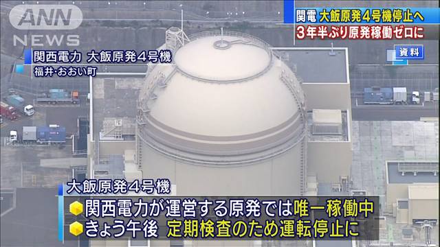 関西電力の大飯原発4号機が3日に定期検査のため停止します。これで3年半ぶりに関西電力のすべての原発が停止することになります。 関西電力が運営して現在、唯一稼働している福井県の大飯原発4号機は午後、定期検査のために運転を停止します。関電は現在、定期検査中の大飯原発3号機の運転を9月にも再開させる予定でしたが配管に傷が見つかり、原子力規制委員会での安全評価が長引いたことから運転再開が数カ月遅れることになりました。福井県高浜町の高浜原発3号機は来月下旬に運転を再開する予定ですが、それまで関電の運営する原発は2017年5月以来、3年半ぶりにゼロになります。国内で稼働している原発は佐賀県にある九州電力玄界原発4号機のみとなります。