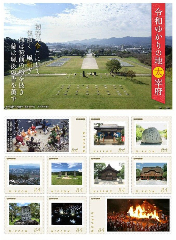 切手は大伴旅人邸で催された「梅花の宴」のジオラマや大宰府政庁跡、太宰府天満宮、万葉歌碑などの写真を取り込んだ10枚で1シートになっている。「太宰府の魅力をギュッと凝縮しています」と企画を担当した地元郵便局長。楠田市長も「切手が太宰府のブランド力の発展につながれば」とご満悦だった。