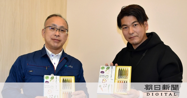 野菜の芯や切れ端が原料で、子どもが口に入れても安全な「にしみの おやさいクレヨン」を岐阜県大垣市の就労継続支援A型事業所「シュシュ」が開発した。ニンジンや紫キャベツなど野菜そのものの色を生かした10色。野菜メーカーがカット野菜の未使用部分を提供するなど、西濃地方で集めた野菜でつくられた地域発の製品だ。