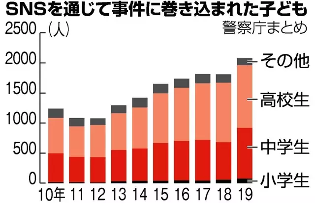 被害者は高校生1044人、中学生847人、小学生72人で、中高生が全体の9割を占めた。中学生は前年よりも223人(35・7%)多く、近年で最も増加率が際立つ。警察庁は「スマホが中学生に普及しつつあることが背景にある」とみている。小学生も増加傾向で、この10年間で5倍になった。
