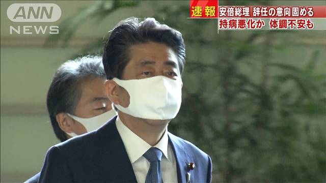 体調不安がささやかれていた安倍総理大臣が辞任する意向を固めたことが分かりました。 政府関係者によりますと、安倍総理は辞任する意向を固めました。28日午後2時すぎに自民党本部に入り、二階幹事長と面会していて辞任する意向を伝えているとみられます。この後、記者会見を行って理由を説明するものとみられます。安倍総理は今月に2週連続で東京都内の大学病院に通うなど体調不安がささやかれていました。官邸側は「検査を受けた」と発表するにとどめていましたが、持病の潰瘍(かいよう)性大腸炎の悪化などが取り沙汰されています。安倍総理が辞意を固めたことで、今後の焦点は「ポスト安倍」の総裁選びとなります。